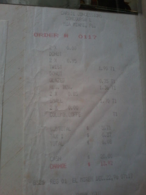 We flew into Miami International Airport after about a 16 hours journey and had a 6 hour or so wait before our connecting flight to Orlando. We found a lovely little coffee shop/restaurant that was luckily open at 6am in the morning and they had the freshest donuts, twisted and glazed for only $0.95!! They were delicious!!